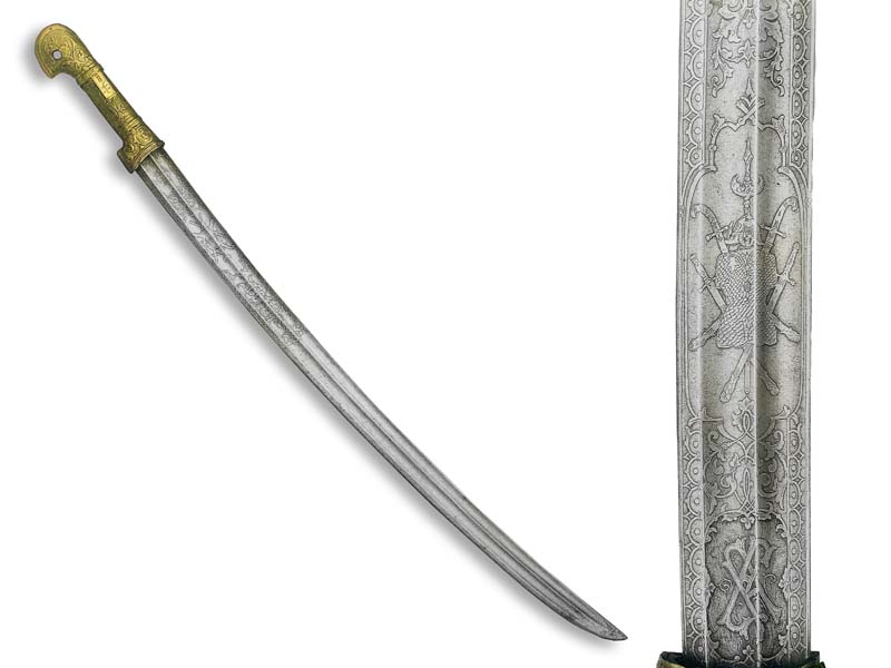 Клинок с двумя долами. В верхней части клинок с обеих сторон украшен травлением и золочением: орнамент, восточные надписи. На нижней части рукояти выгравирована монограмма владельца — буквы «Н Р» под дворянской короной, а также выбито клеймо «ШАФЪ СЫНОВЬЯ С. ПЕТЕРБУРГЪ».