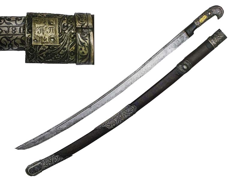 Клинок с двумя долами. С обеих сторон клинок украшен восточными надписями. С левой стороны клинка нанесена надпись: «1912 г. М.А. Татаровъ». Рукоять роговая. Головка рукояти покрыта белым металлом, украшенным чернью. Металлический прибор ножен украшен чернью.