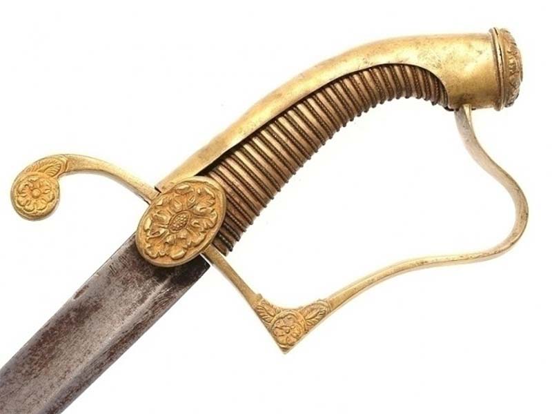 Эфес русской купеческой сабли латунный, состоит из рукояти и гарды. Рукоять по желобкам обмотана витой проволокой. Спинку рукояти покрывает планка, переходящая в головку, на которой сверху фигурная розетка. От крестовины под прямым углом отходит защитная дужка, соединяющаяся с головкой рукояти. В средней части крестовины овальная (с розеткой) или ромбовидная гладкая накладка. Конец крестовины закруглен и загнут вниз.