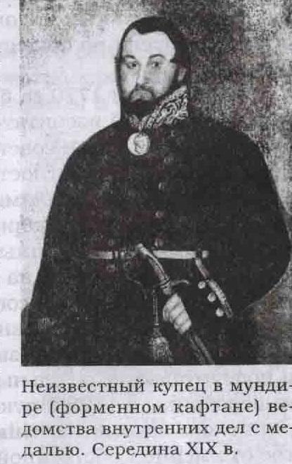 Изображение такого кафтана (двубортный, без выреза юбки спереди) с мундирным шитьем 8-го разряда ведомства путей сообщения можно видеть на портрете купца 2-й гильдии Ф. И. Тюменева