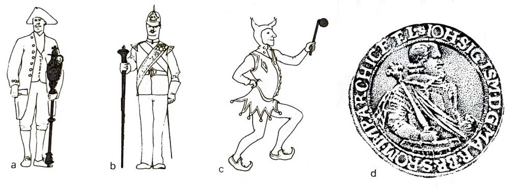 c) Придворный шут со своим традиционным КЛОУНСКИМ скипетром (мочевой пузырь на тросточке).