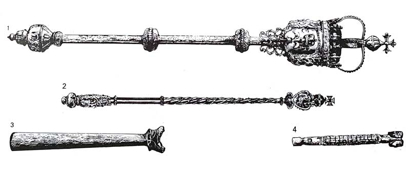 1.Булава для официальных церемоний города Стамфорд, Линкольншир. Позолоченное серебро. Около 1660 г. (Ратуша Стамфорда, Англия). 2.Скипетр из британской королевской сокровищницы. (Тауэр, Лондон). 3.Каменный скипетр из древней Колумбии. (Музей золота, Богота). 4.Деревянный скипетр, украшенный перламутром. Соломоновы острова.