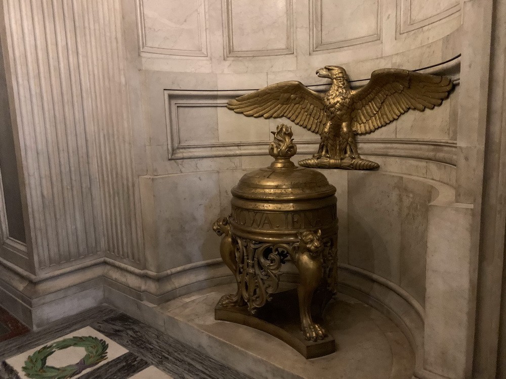Могила Наполеона була спроектована архітектором Вісконті (1791-1853).Він виготовлений з червоного порфіру на основі зеленого граніту і оточений вінком з лаврів і написів про великі перемоги Імперії.Тіло імператора було закладено в могилі 2 квітня 1861 року.