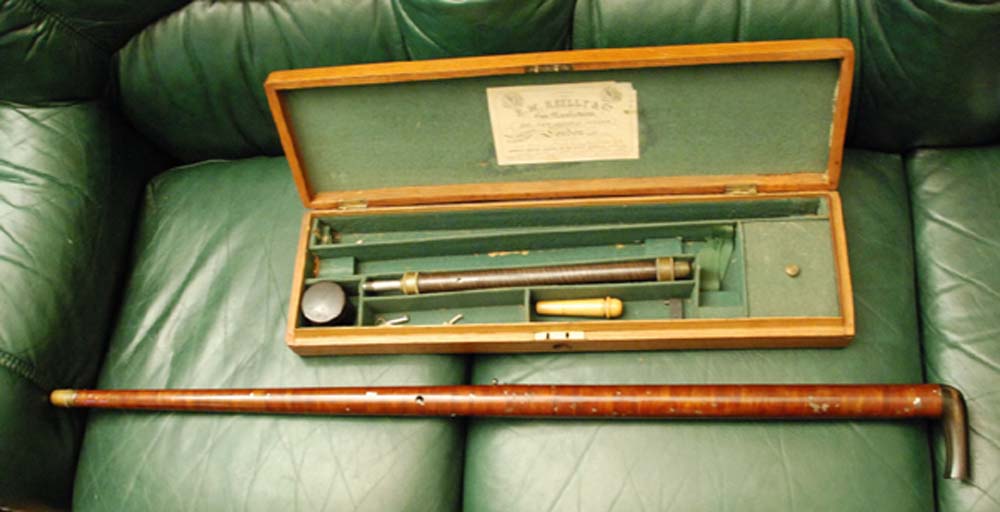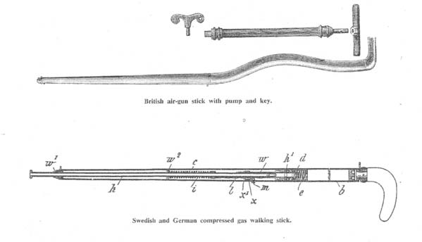 Зверху на знімку: британська тростина-пістолет з насосом і гайковим ключем,Знизу : шведська і німецька тростина-пістолет.