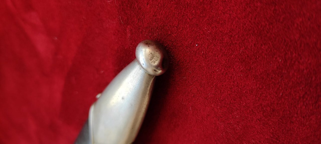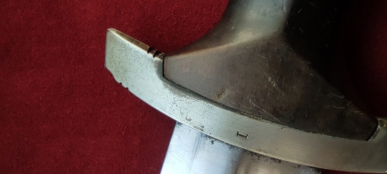 Руків’я з мореного дерева чорного кольору. Руків’я у верхній частині має вставку у вигляді чорного емалевого круга з рунами, у середній частині руків’я– металевий знак у вигляді стилізованого зображення орла, посрібнене, що розкинув крила, що тримає у пазурах вінок зі свастикою. Металеві елементи гарди виготовлені з мельхіору. Хрестовина С-подібна, білого металу, з кінцями, трохи загнутими вгору, у дещо збільшеному та перевернутому вигляді копіює навершя руків’я.