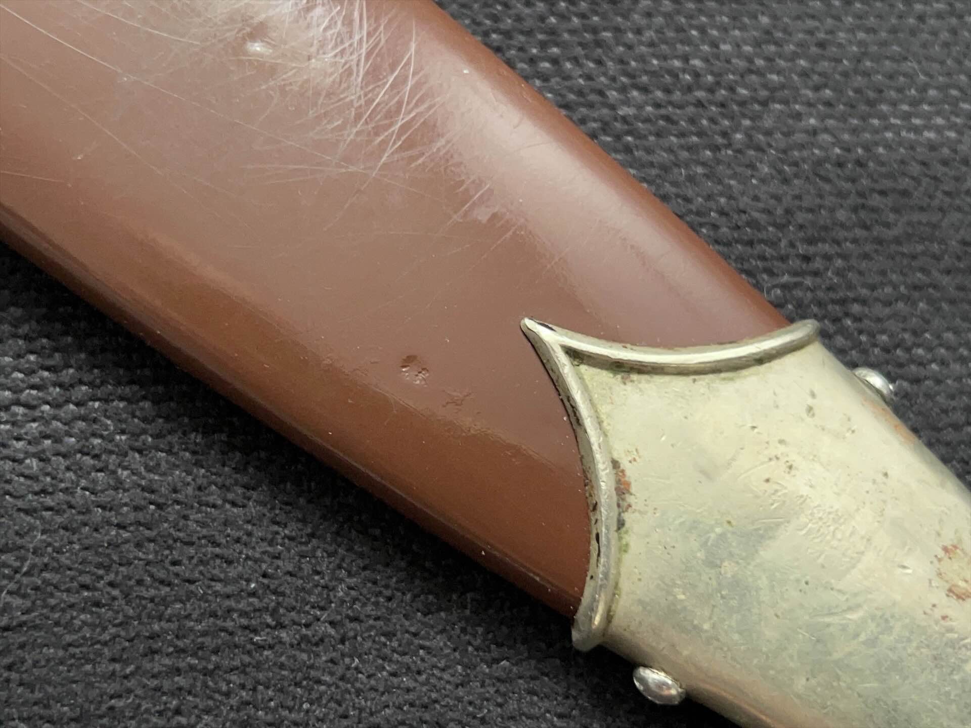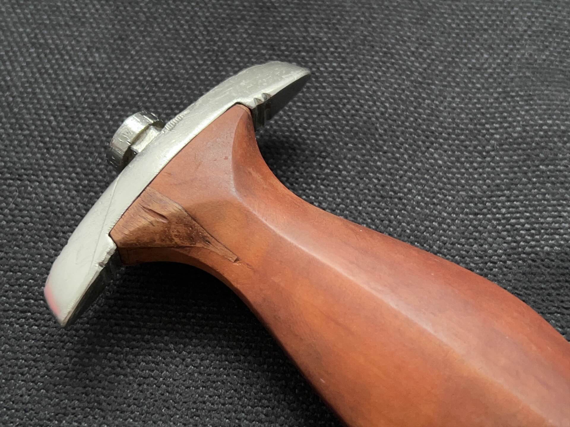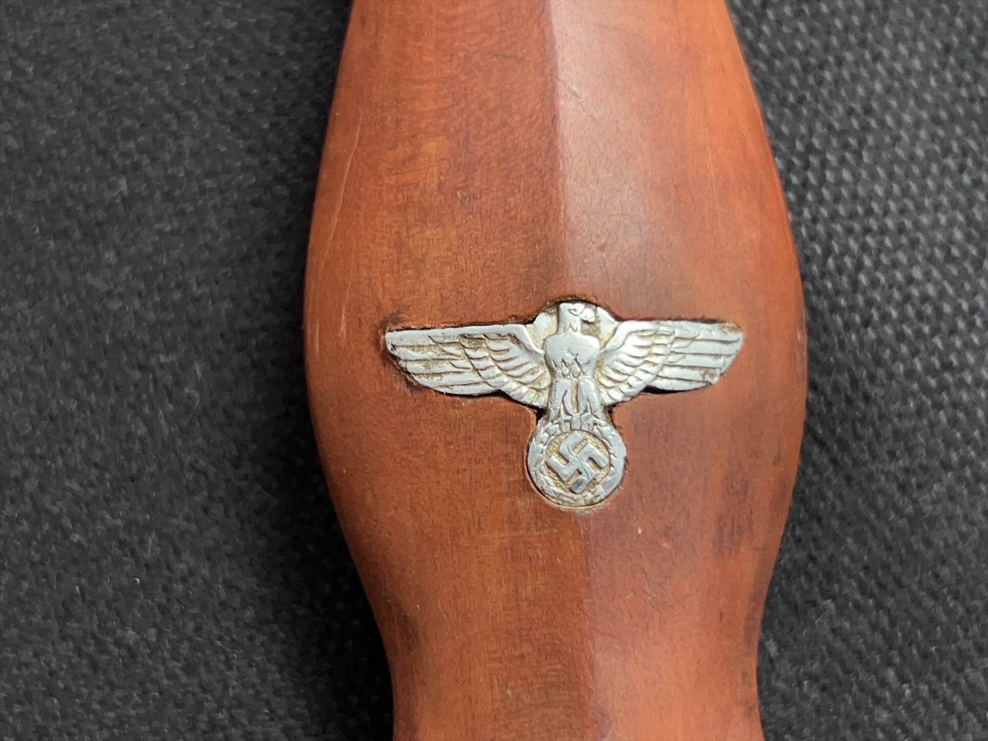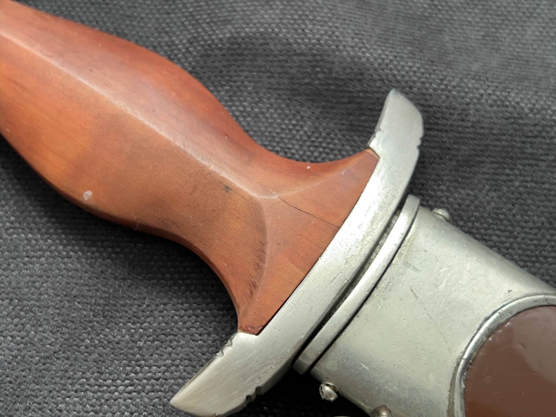 Руків’я дерев’яне, коричневого кольору, з сильно вигнутими контурами. Верхня частина руків’я вигнута донизу, конічна у перерізі. Крізь неї проходить хвостовик клинка, який зверху накручується кругла гайка. На лицьовій стороні руків’я зверху, на трикутній площині, врізана кругла емалева емблема, а в центрі руків’я врізане зображення орла, що розкинув крила, зі свастикою в пазурах.