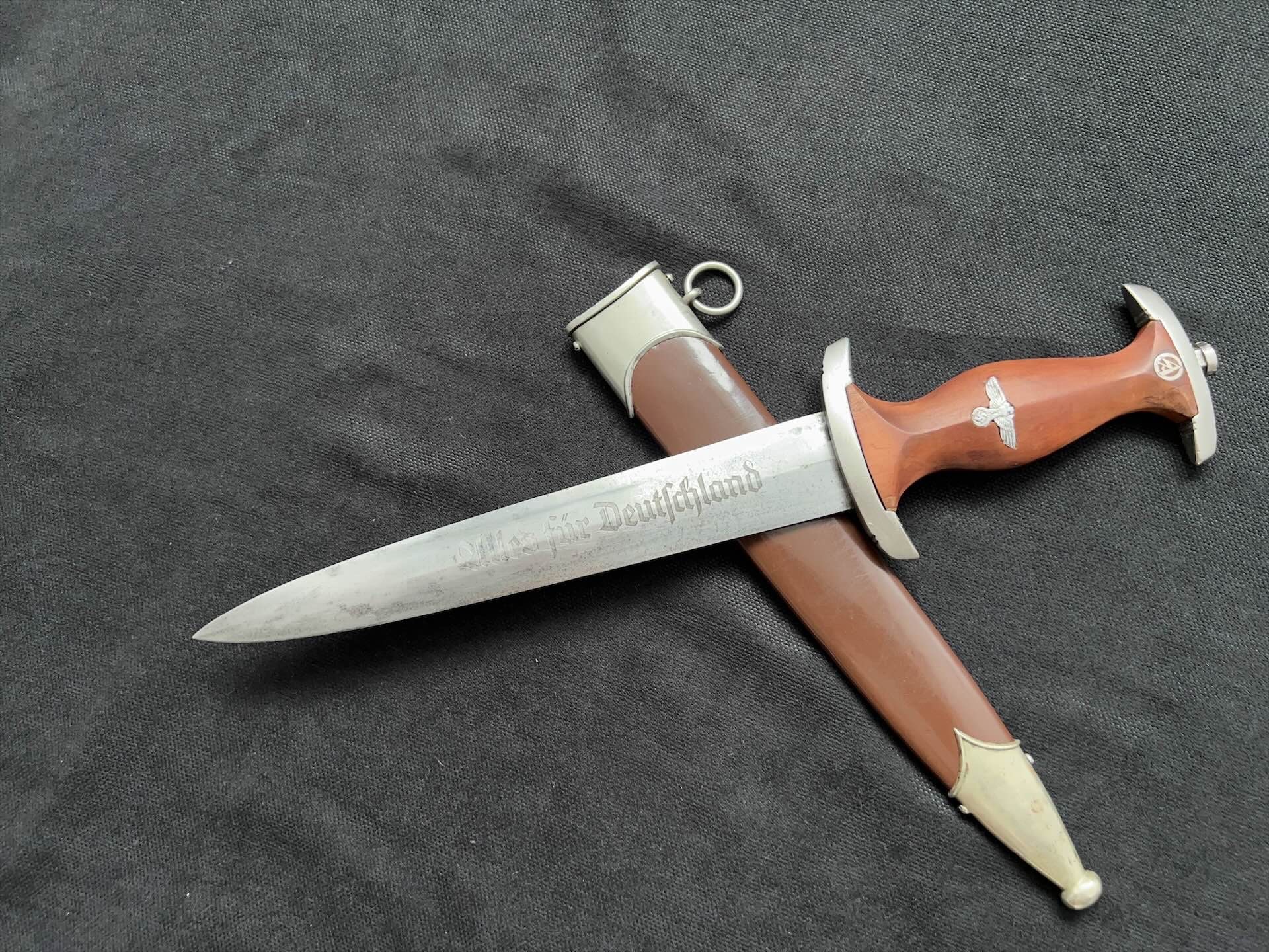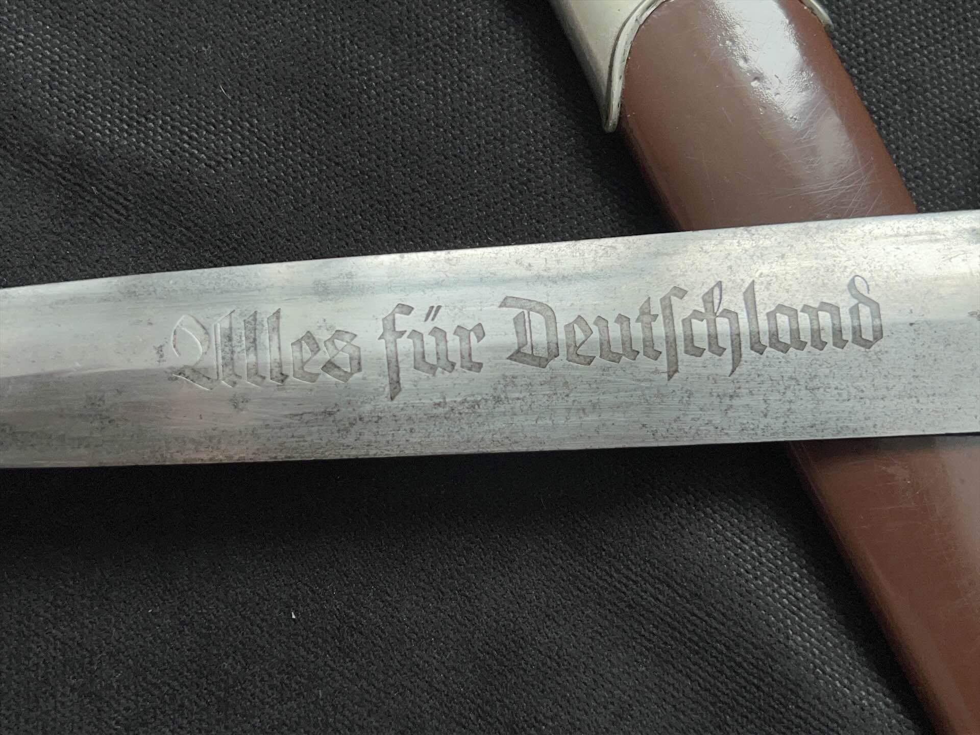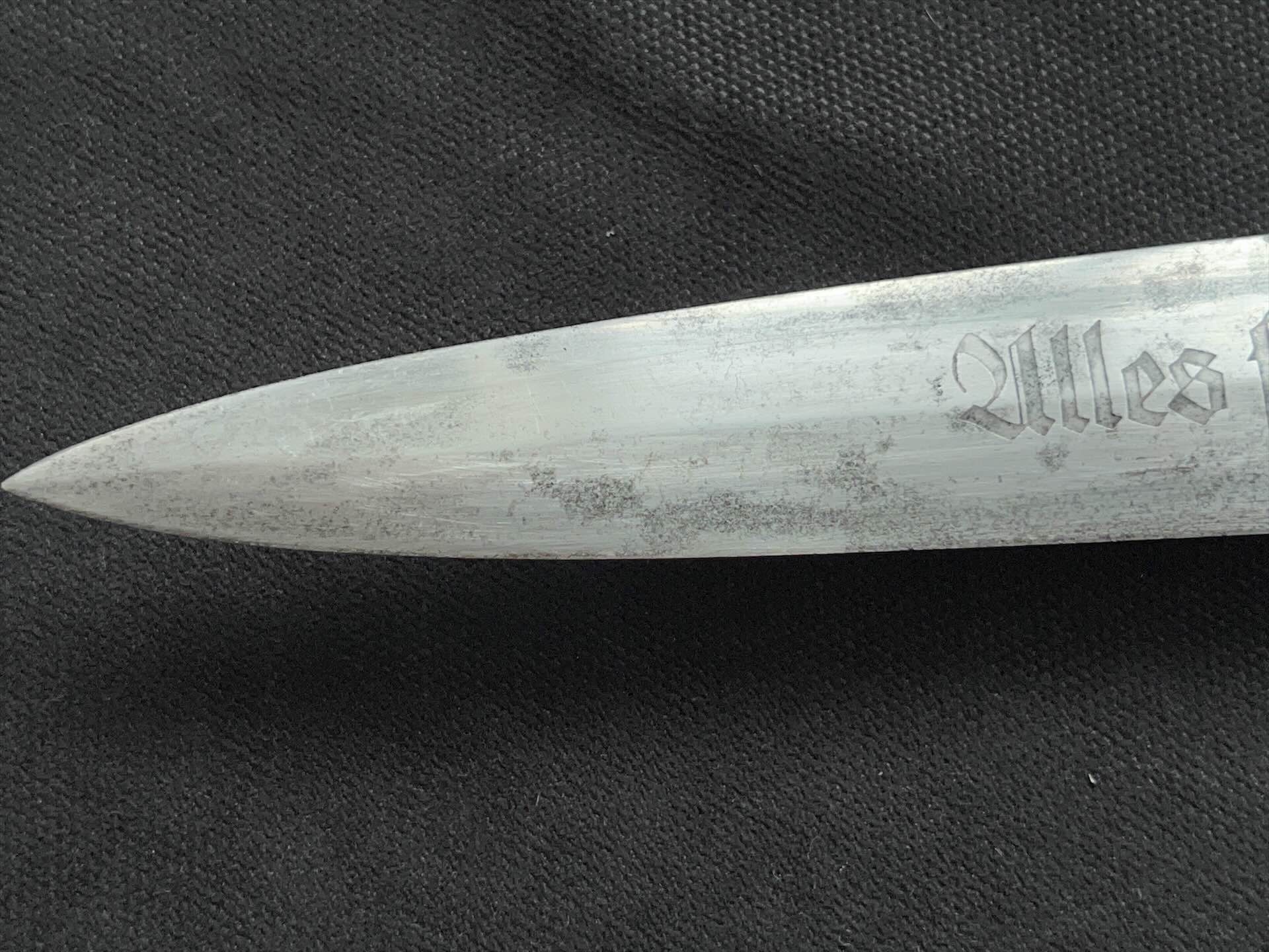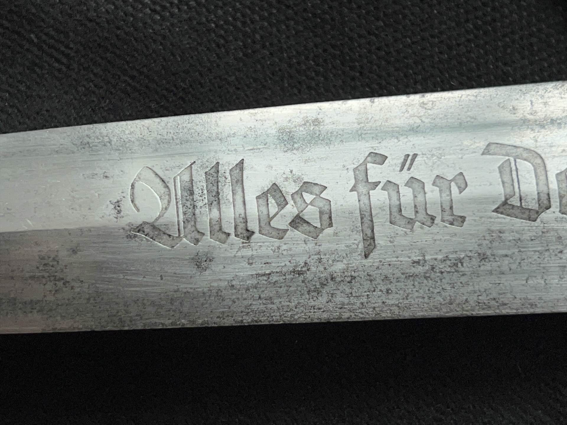 Клинок прямий, двогострий, плоский, ромбічний, плавно звужується до вістря, полірований. На лицьовій стороні напис готичним шрифтом «Alles fur Deutschland» — «Все для Німеччини». На п’ятій клинку є код RZM7/51, а також тавро німецької фірми «Anton Wingen Solingen» у вигляді лицаря.